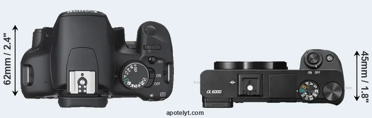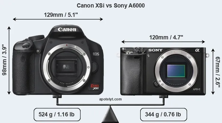 The physical size and weight of the Canon XSi and the Sony A6000 are illustrated in the side-by-side display below. The two cameras are presented according to their relative size. Three successive views from the front, the top, and the rear are shown. All size dimensions are rounded to the nearest millimeter.