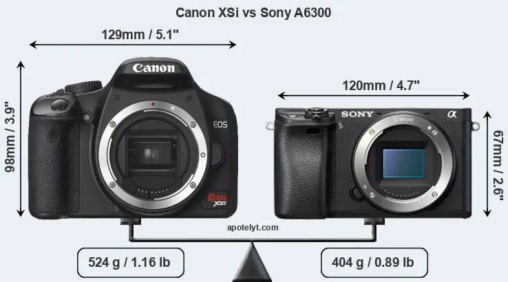 The physical size and weight of the Canon XSi and the Sony A6300 are illustrated in the side-by-side display below. The two cameras are presented according to their relative size. Three successive views from the front, the top, and the rear are shown. All size dimensions are rounded to the nearest millimeter.