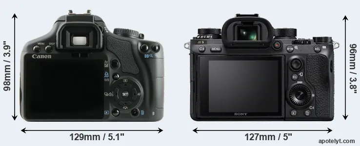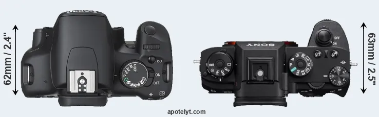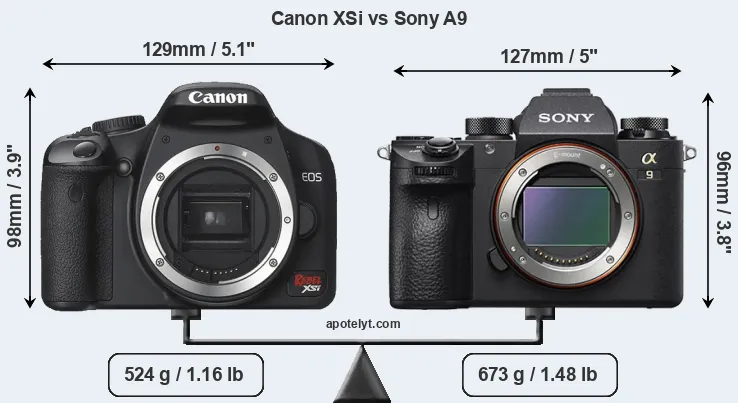The physical size and weight of the Canon XSi and the Sony A9 are illustrated in the side-by-side display below. The two cameras are presented according to their relative size. Three consecutive perspectives from the front, the top, and the back are available. All width, height and depth dimensions are rounded to the nearest millimeter.