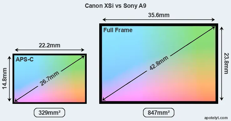 Of the two cameras under consideration, the Canon XSi features an APS-C sensor and the Sony A9 a full frame sensor. The sensor area in the A9 is 157 percent bigger. As a result of these sensor size differences, the cameras have a format factor of, respectively, 1.6 and 1.0. Both cameras have a native aspect ratio (sensor width to sensor height) of 3:2.