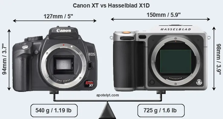 If the front view area (width x height) of the cameras is taken as an aggregate measure of their size, the Hasselblad X1D is notably larger (23 percent) than the Canon XT. Moreover, the X1D is markedly heavier (34 percent) than the XT. It is noteworthy in this context that the X1D is splash and dust-proof, while the XT does not feature any corresponding weather-sealing.