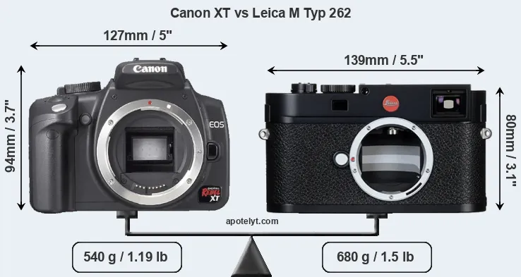 An illustration of the physical size and weight of the Canon XT and the Leica M Typ 262 is provided in the side-by-side display below. The two cameras are presented according to their relative size. Three consecutive views from the front, the top, and the rear side are shown. All width, height and depth measures are rounded to the nearest millimeter.