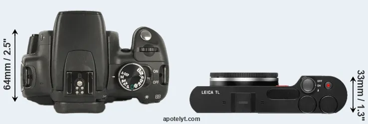 The physical size and weight of the Canon XT and the Leica TL are illustrated in the side-by-side display below. The two cameras are presented according to their relative size. Three consecutive perspectives from the front, the top, and the back are available. All width, height and depth dimensions are rounded to the nearest millimeter.