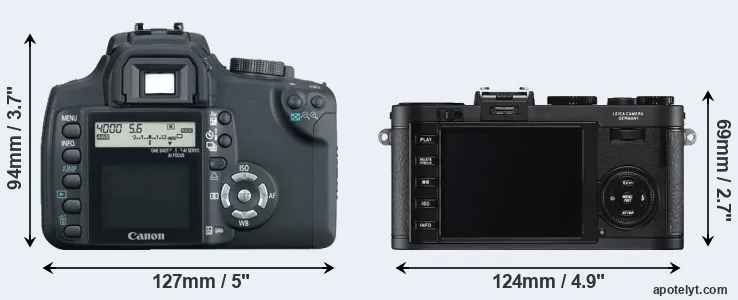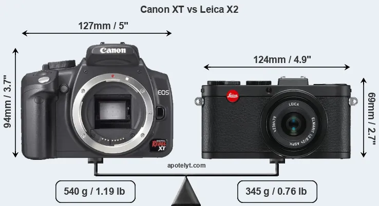 The physical size and weight of the Canon XT and the Leica X2 are illustrated in the side-by-side display below. The two cameras are presented according to their relative size. Three consecutive perspectives from the front, the top, and the back are available. All width, height and depth dimensions are rounded to the nearest millimeter.