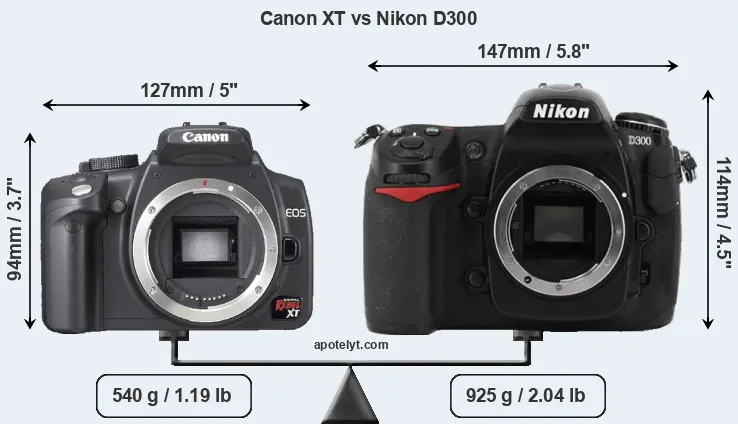 If the front view area (width x height) of the cameras is taken as an aggregate measure of their size, the Nikon D300 is notably larger (40 percent) than the Canon XT. Moreover, the D300 is substantially heavier (71 percent) than the XT. It is noteworthy in this context that the D300 is splash and dust-proof, while the XT does not feature any corresponding weather-sealing.