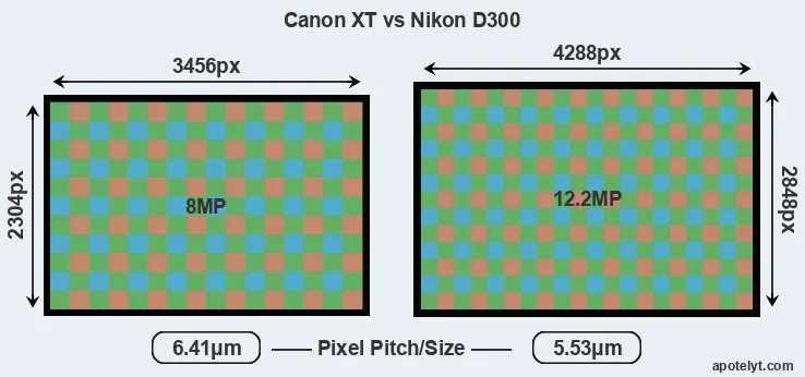 With 12.2MP, the D300 offers a higher resolution than the XT (8MP), but the D300 has smaller individual pixels (pixel pitch of 5.53μm versus 6.41μm for the XT). Yet, the D300 is a much more recent model (by 2 years and 6 months) than the XT, and its sensor will have benefitted from technological advances during this time that enhance the light gathering capacity of its pixel-units.