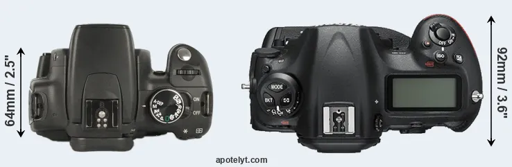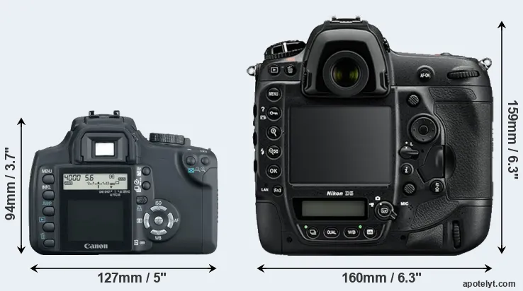 The side-by-side display below illustrates the physical size and weight of the Canon XT and the Nikon D5. The two cameras are presented according to their relative size. Three successive views from the front, the top, and the rear are shown. All width, height and depth measures are rounded to the nearest millimeter.