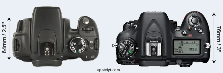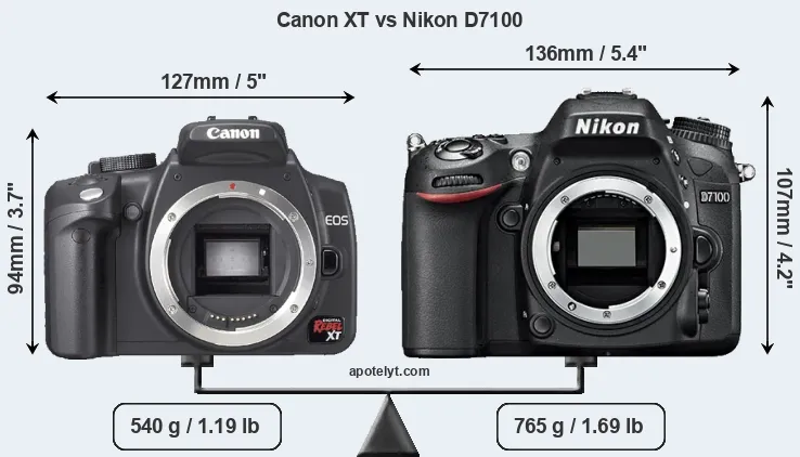 The physical size and weight of the Canon XT and the Nikon D7100 are illustrated in the side-by-side display below. The two cameras are presented according to their relative size. Three consecutive perspectives from the front, the top, and the back are available. All size dimensions are rounded to the nearest millimeter.
