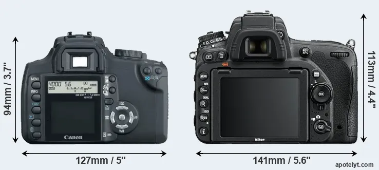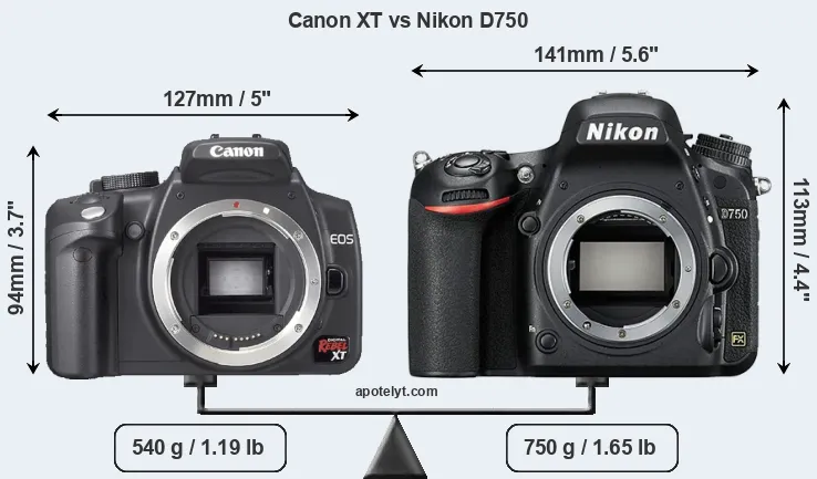 The side-by-side display below illustrates the physical size and weight of the Canon XT and the Nikon D750. The two cameras are presented according to their relative size. Three consecutive perspectives from the front, the top, and the back are available. All size dimensions are rounded to the nearest millimeter.