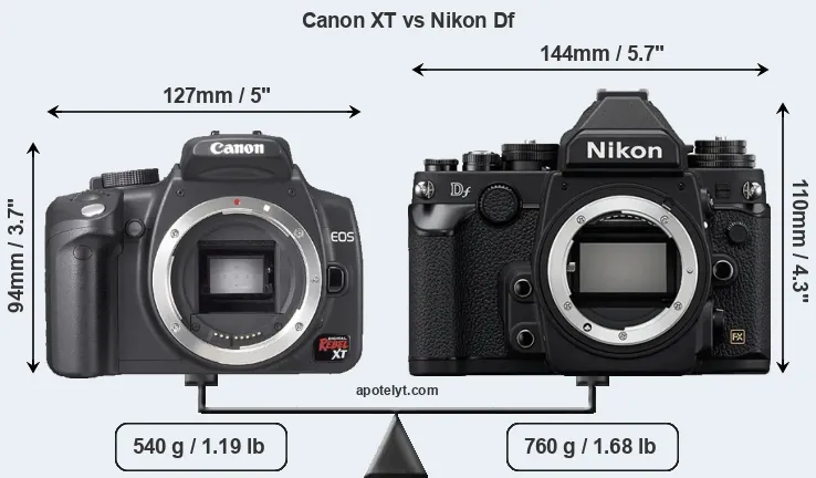 If the front view area (width x height) of the cameras is taken as an aggregate measure of their size, the Nikon Df is notably larger (33 percent) than the Canon XT. Moreover, the Df is substantially heavier (41 percent) than the XT. It is noteworthy in this context that the Df is splash and dust-proof, while the XT does not feature any corresponding weather-sealing.