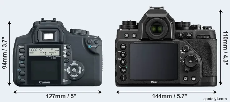 The physical size and weight of the Canon XT and the Nikon Df are illustrated in the side-by-side display below. The two cameras are presented according to their relative size. Three successive views from the front, the top, and the rear are shown. All width, height and depth measures are rounded to the nearest millimeter.