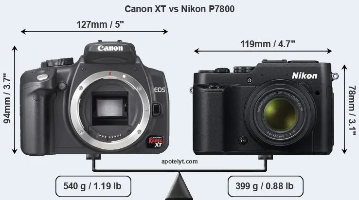 The physical size and weight of the Canon XT and the Nikon P7800 are illustrated in the side-by-side display below. The two cameras are presented according to their relative size. Three successive views from the front, the top, and the rear are shown. All size dimensions are rounded to the nearest millimeter.