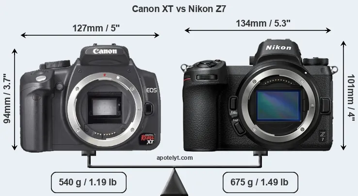 An illustration of the physical size and weight of the Canon XT and the Nikon Z7 is provided in the side-by-side display below. The two cameras are presented according to their relative size. Three consecutive perspectives from the front, the top, and the back are available. All width, height and depth dimensions are rounded to the nearest millimeter.