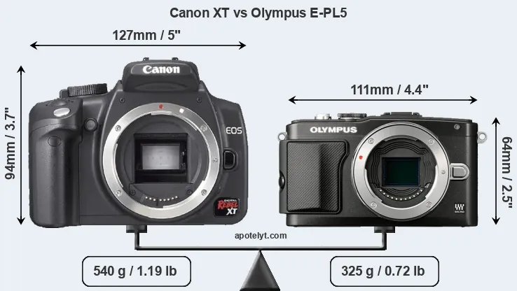 If the front view area (width x height) of the cameras is taken as an aggregate measure of their size, the Olympus E-PL5 is considerably smaller (40 percent) than the Canon XT. Moreover, the E-PL5 is substantially lighter (40 percent) than the XT. In this context, it is worth noting that neither the XT nor the E-PL5 are weather-sealed.