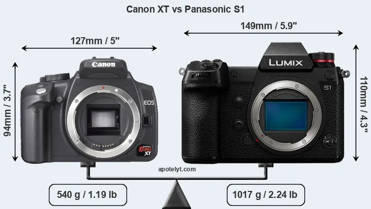 If the front view area (width x height) of the cameras is taken as an aggregate measure of their size, the Panasonic S1 is notably larger (37 percent) than the Canon XT. Moreover, the S1 is substantially heavier (88 percent) than the XT. It is noteworthy in this context that the S1 is splash and dust-proof, while the XT does not feature any corresponding weather-sealing.