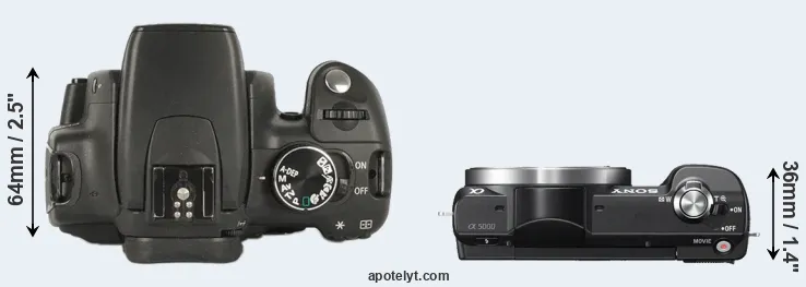 The physical size and weight of the Canon XT and the Sony A5000 are illustrated in the side-by-side display below. The two cameras are presented according to their relative size. Three successive views from the front, the top, and the rear are shown. All width, height and depth dimensions are rounded to the nearest millimeter.