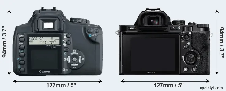 In this particular case, the Canon XT and the Sony A7 have exactly the same width and height, and, thus, have identically-sized bodies. However, the Sony is markedly lighter (12 percent) than the Canon. It is noteworthy in this context that the A7 is splash and dust-proof, while the XT does not feature any corresponding weather-sealing.