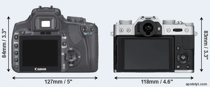 The side-by-side display below illustrates the physical size and weight of the Canon XTi and the Fujifilm X-T10. The two cameras are presented according to their relative size. Three consecutive perspectives from the front, the top, and the back are available. All width, height and depth measures are rounded to the nearest millimeter.