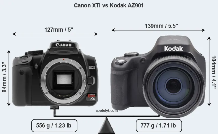 An illustration of the physical size and weight of the Canon XTi and the Kodak AZ901 is provided in the side-by-side display below. The two cameras are presented according to their relative size. Three successive views from the front, the top, and the rear are shown. All width, height and depth dimensions are rounded to the nearest millimeter.