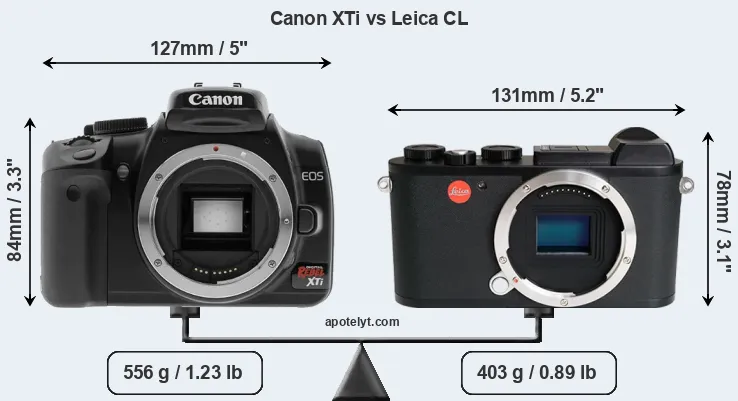 If the front view area (width x height) of the cameras is taken as an aggregate measure of their size, the Leica CL is somewhat smaller (4 percent) than the Canon XTi. Moreover, the CL is markedly lighter (28 percent) than the XTi. In this context, it is worth noting that neither the XTi nor the CL are weather-sealed.