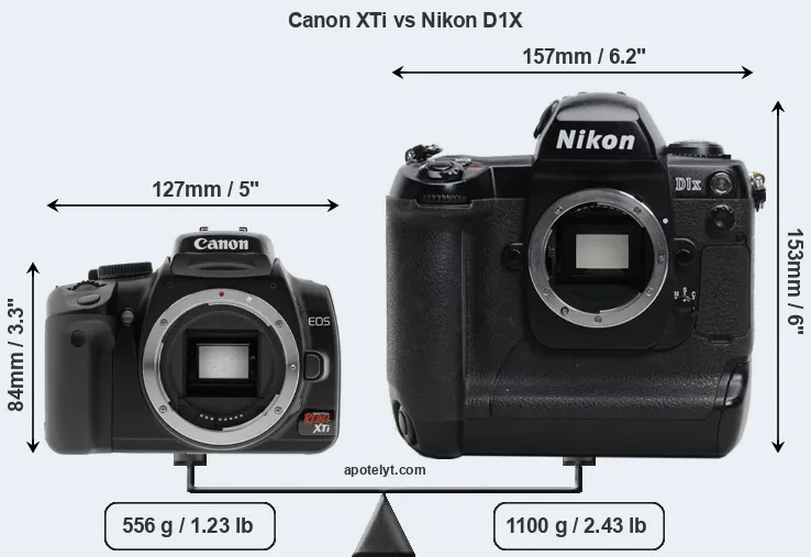 The physical size and weight of the Canon XTi and the Nikon D1X are illustrated in the side-by-side display below. The two cameras are presented according to their relative size. Three consecutive perspectives from the front, the top, and the back are available. All width, height and depth measures are rounded to the nearest millimeter.