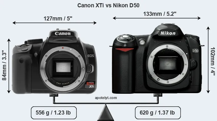 The physical size and weight of the Canon XTi and the Nikon D50 are illustrated in the side-by-side display below. The two cameras are presented according to their relative size. Three consecutive perspectives from the front, the top, and the back are available. All width, height and depth dimensions are rounded to the nearest millimeter.