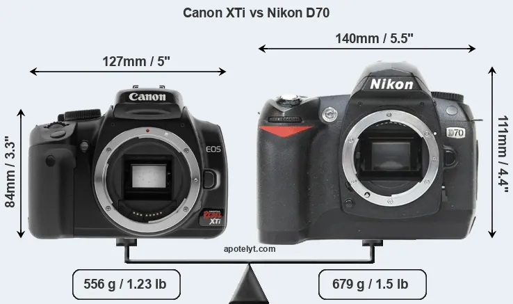 The above size and weight comparisons are to some extent incomplete since they do not consider the interchangeable lenses that both of these cameras require. Yet, since both cameras are based around an APS-C sensor, their respective lenses will tend to have similar dimensions and heft. You can compare the optics available for the two cameras in the Canon EF Lens Catalog (XTi) and the Nikon Lens Catalog (D70).
