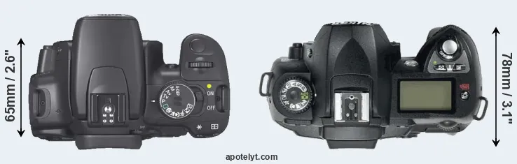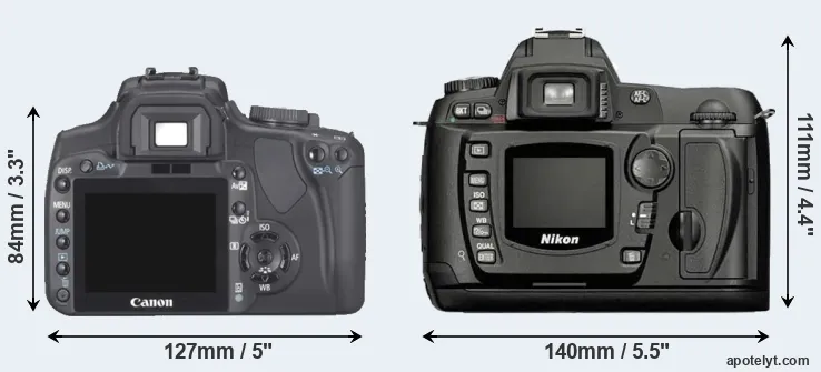 The physical size and weight of the Canon XTi and the Nikon D70 are illustrated in the side-by-side display below. The two cameras are presented according to their relative size. Three consecutive perspectives from the front, the top, and the back are available. All width, height and depth dimensions are rounded to the nearest millimeter.