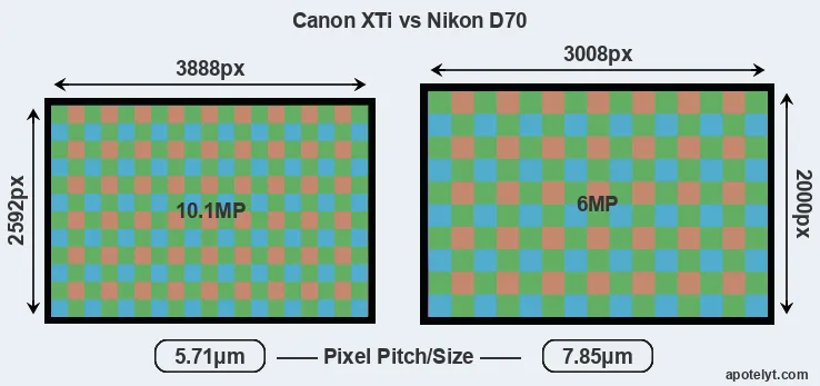 Despite having a smaller sensor, the Canon XTi offers a higher resolution of 10.1 megapixels, compared with 6 MP of the Nikon D70. This megapixels advantage comes at the cost of a higher pixel density and a smaller size of the individual pixel (with a pixel pitch of 5.71μm versus 7.85μm for the D70). However, it should be noted that the XTi is much more recent (by 2 years and 6 months) than the D70, and its sensor will have benefitted from technological advances during this time that make it possible to gather light more efficiently.