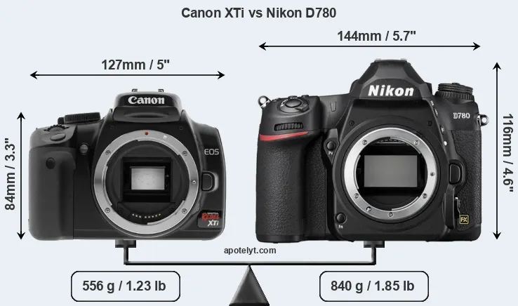 An illustration of the physical size and weight of the Canon XTi and the Nikon D780 is provided in the side-by-side display below. The two cameras are presented according to their relative size. Three consecutive perspectives from the front, the top, and the back are available. All size dimensions are rounded to the nearest millimeter.