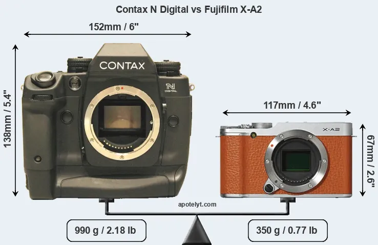 The physical size and weight of the Contax N Digital and the Fujifilm X-A2 are illustrated in the side-by-side display below. The two cameras are presented according to their relative size. Three consecutive perspectives from the front, the top, and the back are available. All width, height and depth dimensions are rounded to the nearest millimeter.