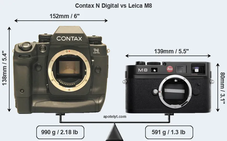 If the front view area (width x height) of the cameras is taken as an aggregate measure of their size, the Leica M8 is considerably smaller (47 percent) than the Contax N Digital. Moreover, the M8 is substantially lighter (40 percent) than the N Digital. In this context, it is worth noting that neither the N Digital nor the M8 are weather-sealed.