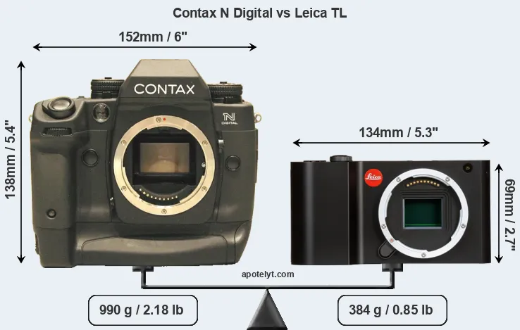 If the front view area (width x height) of the cameras is taken as an aggregate measure of their size, the Leica TL is considerably smaller (56 percent) than the Contax N Digital. Moreover, the TL is substantially lighter (61 percent) than the N Digital. In this context, it is worth noting that neither the N Digital nor the TL are weather-sealed.