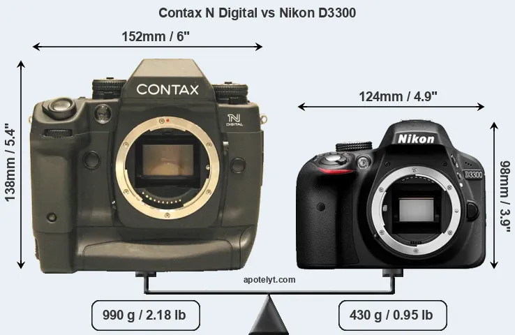 If the front view area (width x height) of the cameras is taken as an aggregate measure of their size, the Nikon D3300 is considerably smaller (42 percent) than the Contax N Digital. Moreover, the D3300 is substantially lighter (57 percent) than the N Digital. In this context, it is worth noting that neither the N Digital nor the D3300 are weather-sealed.