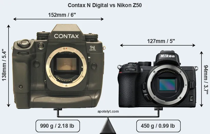 If the front view area (width x height) of the cameras is taken as an aggregate measure of their size, the Nikon Z50 is considerably smaller (43 percent) than the Contax N Digital. Moreover, the Z50 is substantially lighter (55 percent) than the N Digital. It is noteworthy in this context that the Z50 is splash and dust-proof, while the N Digital does not feature any corresponding weather-sealing.