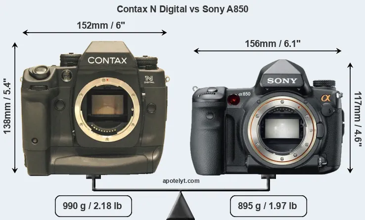 An illustration of the physical size and weight of the Contax N Digital and the Sony A850 is provided in the side-by-side display below. The two cameras are presented according to their relative size. Three consecutive views from the front, the top, and the rear side are shown. All width, height and depth measures are rounded to the nearest millimeter.