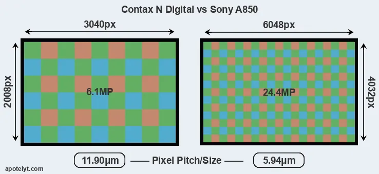 Despite having a slightly smaller sensor, the A850 offers a higher resolution of 24.4 megapixels, compared with 6.1 MP of the N Digital. This megapixels advantage comes at the cost of a higher pixel density and a smaller size of the individual pixel (with a pixel pitch of 5.94μm versus 11.90μm for the N Digital). However, it should be noted that the A850 is much more recent (by 7 years and 5 months) than the N Digital, and its sensor will have benefitted from technological advances during this time that make it possible to gather light more efficiently.