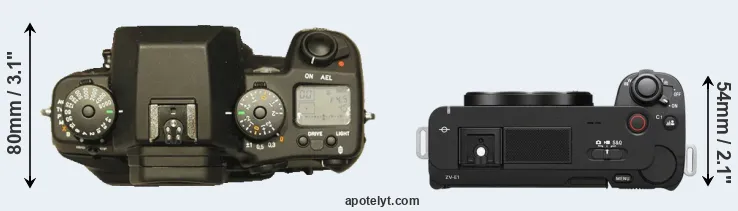 The physical size and weight of the Contax N Digital and the Sony ZV-E1 are illustrated in the side-by-side display below. The two cameras are presented according to their relative size. Three consecutive views from the front, the top, and the rear side are shown. All width, height and depth dimensions are rounded to the nearest millimeter.