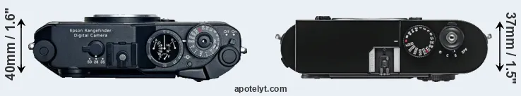An illustration of the physical size and weight of the Epson R-D1 and the Leica M9 is provided in the side-by-side display below. The two cameras are presented according to their relative size. Three consecutive views from the front, the top, and the rear side are shown. All width, height and depth measures are rounded to the nearest millimeter.