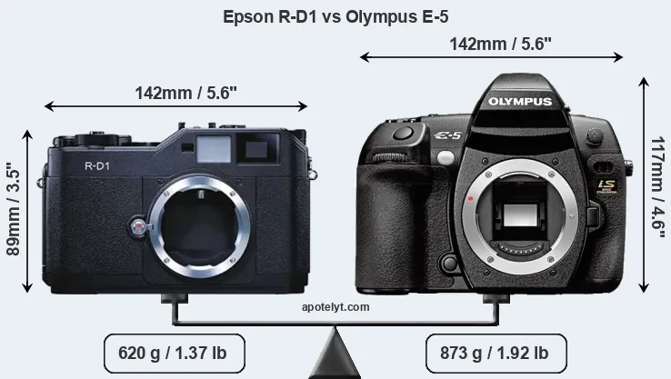 If the front view area (width x height) of the cameras is taken as an aggregate measure of their size, the Olympus E-5 is notably larger (31 percent) than the Epson R-D1. Moreover, the E-5 is substantially heavier (41 percent) than the R-D1. It is noteworthy in this context that the E-5 is splash and dust-proof, while the R-D1 does not feature any corresponding weather-sealing.