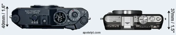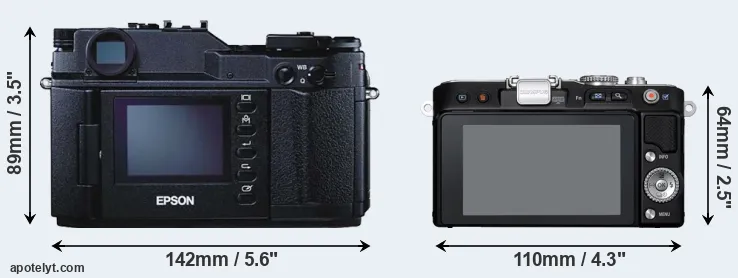 The physical size and weight of the Epson R-D1 and the Olympus E-PL3 are illustrated in the side-by-side display below. The two cameras are presented according to their relative size. Three successive views from the front, the top, and the rear are shown. All width, height and depth dimensions are rounded to the nearest millimeter.