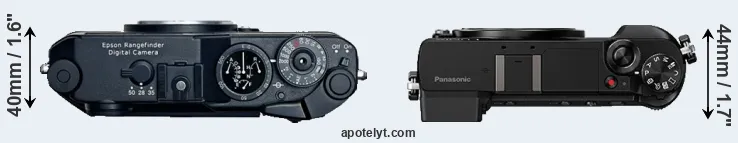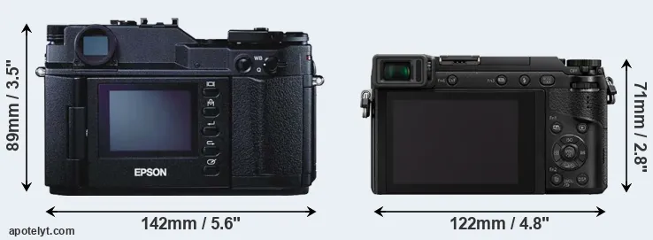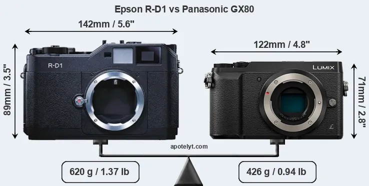 The side-by-side display below illustrates the physical size and weight of the Epson R-D1 and the Panasonic GX80. The two cameras are presented according to their relative size. Three consecutive perspectives from the front, the top, and the back are available. All width, height and depth dimensions are rounded to the nearest millimeter.