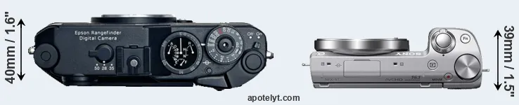 An illustration of the physical size and weight of the Epson R-D1 and the Sony NEX-5T is provided in the side-by-side display below. The two cameras are presented according to their relative size. Three successive views from the front, the top, and the rear are shown. All width, height and depth dimensions are rounded to the nearest millimeter.