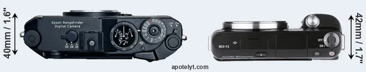 The side-by-side display below illustrates the physical size and weight of the Epson R-D1 and the Sony NEX-F3. The two cameras are presented according to their relative size. Three consecutive perspectives from the front, the top, and the back are available. All size dimensions are rounded to the nearest millimeter.
