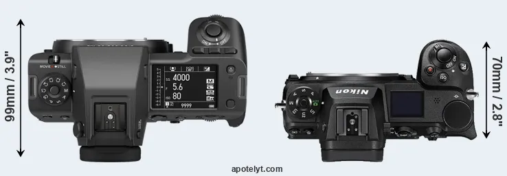 The side-by-side display below illustrates the physical size and weight of the Fujifilm GFX 100 II and the Nikon Z6 II. The two cameras are presented according to their relative size. Three successive views from the front, the top, and the rear are shown. All width, height and depth measures are rounded to the nearest millimeter.