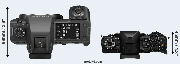 The physical size and weight of the Fujifilm GFX 100 II and the Olympus E-M5 II are illustrated in the side-by-side display below. The two cameras are presented according to their relative size. Three consecutive views from the front, the top, and the rear side are shown. All width, height and depth dimensions are rounded to the nearest millimeter.