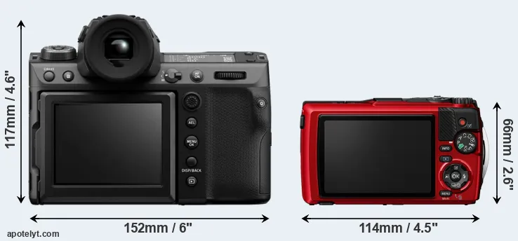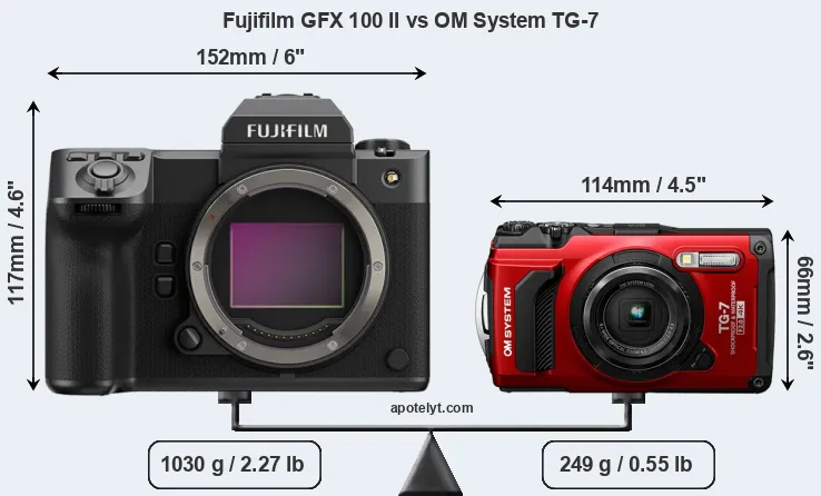 The above size and weight comparisons are to some extent incomplete and possibly misleading, as the TG-7 has a lens built in, whereas the GFX 100 II is an interchangeable lens camera that requires a separate lens. Attaching the latter will add extra weight and bulk to the setup.