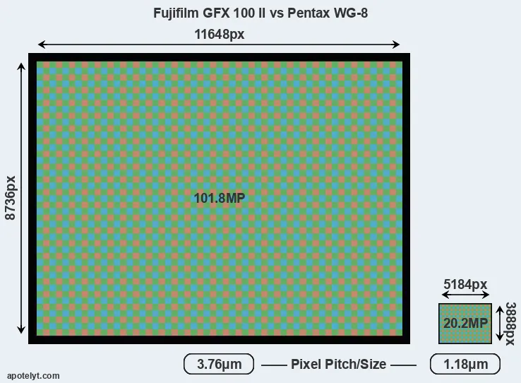 | Sensor Specs | Fujifilm GFX 100 II | Pentax WG-8 |