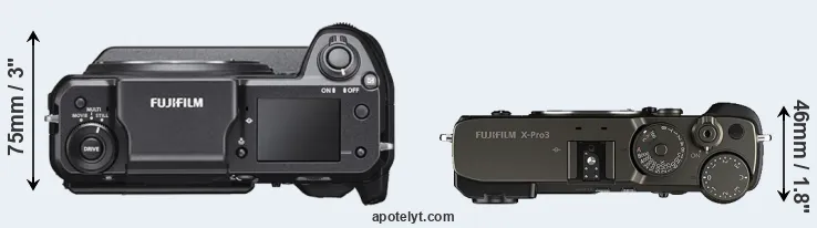 An illustration of the physical size and weight of the Fujifilm GFX 100 and the Fujifilm X-Pro3 is provided in the side-by-side display below. The two cameras are presented according to their relative size. Three consecutive views from the front, the top, and the rear side are shown. All width, height and depth measures are rounded to the nearest millimeter.