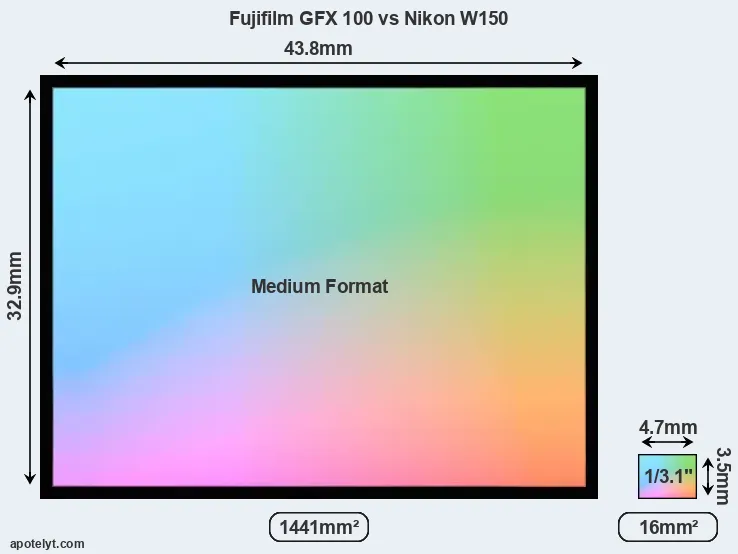 Of the two cameras under consideration, the Fujifilm GFX 100 features a medium format sensor and the Nikon W150 a 1/3.1-inch sensor. The sensor area in the W150 is 99 percent smaller. As a result of these sensor size differences, the cameras have a format factor of, respectively, 0.79 and 7.4. Both cameras feature a native aspect ratio (sensor width to sensor height) of 4:3.